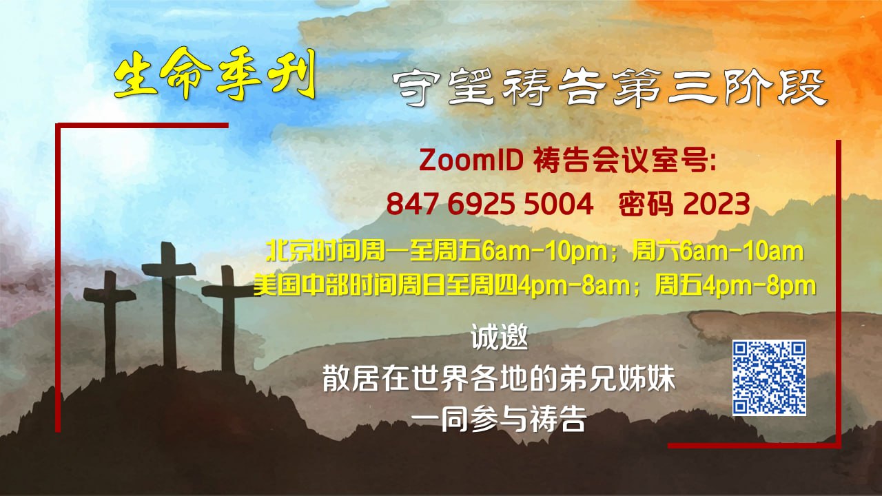 请点击参加祷告👇: 为教会复兴守望祷告(Zoom) 守望祷告时间: 北京时间 周一至周五: 早上六点开始,晚上10点结束 每天祷告16个小时 周六:早上6点-上午10点 美国中部时间 主日至周四: 每天晚4点开始,次日清晨8点结束 周五:晚4点至8点 请转发守望祷告Zoom链接👇: https://us02web.zoom.us/j/84769255004?pwd=OStVZU5BWSt4dXVHb2ZLMFFQbGxqQT09
